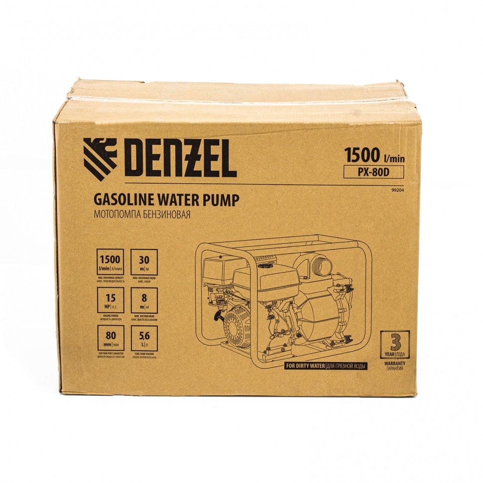 Бензиновая мотопомпа Denzel PX-80D 99204 с двигателем мощностью 15 л. с. и штуцерами диаметром 3 дюйма обеспечивает напор 30 м и применяется для откачки грязной воды со скоростью 1500 л/мин из затопленных помещений, а также котлованов, траншей, погребов, колодцев глубиной до 8 м. Оптимальна для проведения земляных работ, т. к. может работать с грязной водой, содержащей фракции размером до 28 мм. Используется также для подачи чистой воды на стройку, небольшое предприятие, на дачный участок и в систему полива.ПреимуществаНадежность и долговечность — двигатель Denzel Long Life из высококачественных комплектующих обеспечивает длительную стабильную работу мотопомпы.Низкий расход топлива — увеличенный бак объемом 5,6 л позволяет работать до 90 минут без дозаправки.Защита двигателя — при низком уровне масла происходит автоматическое отключение мотопомпы для предотвращения ее поломки.Возможность изменения интенсивности потока воды — конструкцией предусмотрен регулятор оборотов двигателя.Быстрый запуск — двигатель легко заводится в любую погоду благодаря ручному стартеру.Прочность — стальная рама защищает двигатель и насосную часть от механических повреждений.Устойчивость — широкое основание позволяет установить мотопомпу даже на неровной поверхности.Необходимые инструменты в комплекте — к мотопомпе прилагаются хомуты и инструменты для подключения шланга.Подтвержденное качество — гарантия на заводской брак составляет 3 года.