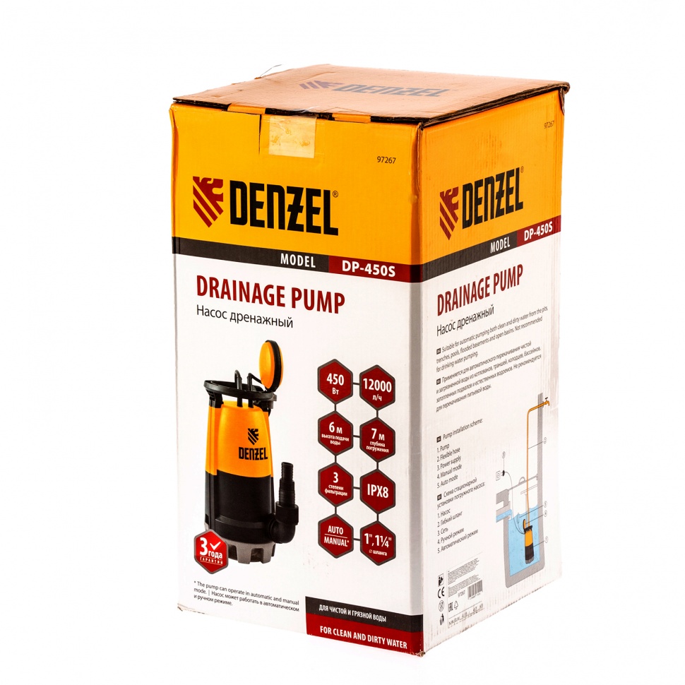 Дренажный насос Denzel DP450S отлично справляется с выкачиванием грязной воды с фракциями до 30 мм из затопленных помещений. Также подходит для подачи чистой воды из колодцев и водоемов или организации системы полива сада и огорода.
