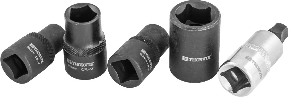 Доставка инструмента Набор головок торцевых и насадки со вставкой-битой с пятигранным профилем для обслуживания тормозных механизмов 1/2"DR, 5 предметов, THORVIK