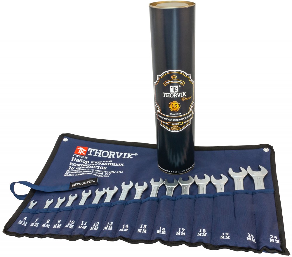 Доставка инструмента Набор ключей комбинированных в сумке, 16 предметов (6-19, 22, 24 мм) (в тубусе Thorvik), THORVIK