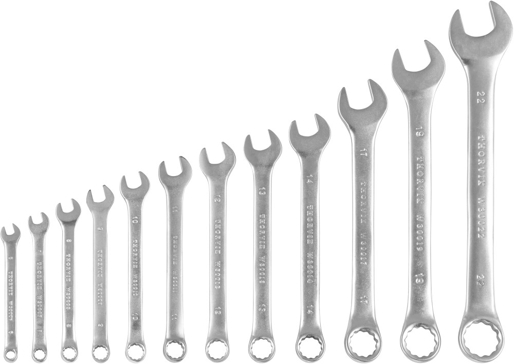 Гаечные ключи Thorvik изготовлены из современных материалов и по технологиям отвечающим жестким требованиям международных и отечественных стандартов. Привычное чечевичное сечение рукояток, устойчивое к агрессивным и механическим воздействиям гальваническое покрытие, разнообразие областей применения, широта размерного ряда, удобные средства хранения наборов ключей, надежность и долговечность делает инструменты Thorvik достойным помощником мастера. При производстве работ по обслуживанию продукции машиностроения используются различные размеры резьбовых крепежных деталей и мастеру в этой ситуации необходимо иметь несколько инструментов, необходимых для выполнения такой работы. При этом извлечение требуемого ключа из, скажем, кармана комбинезона не всегда доставляет требуемый результат и чем больше обслуживаемых размеров, тем выше вероятность ошибки. В таком случае, необходим набор ключей, где каждый ключ имеет отдельный, маркированный по размеру, карман в мягком планшете, именуемом "скруткой", изготовленном из устойчивого к истиранию, пропитанного для защиты от влаги и загрязнений материала. Подбор инструмента, его хранение и транспортировка такое предложение достаточно просто решает. Ключи гаечные комбинированные ключи - универсальные гаечные ключи, совмещающие в себе функционал и преимущества рожковых и накидных ключей. Зевы комбинированных ключей имеют одинаковые размеры. Именно сочетание сильных сторон рожковых и накидных ключей и нивелирование сторон слабых делают комбинированные ключи исключительно широко востребованными со стороны потребителей и применяемыми в самых разных сферах - производственной, ремонтной, авторемонтной, бытовой и других. Ключи гаечные с открытым и кольцевым зевами предназначены для монтажа либо демонтажа резьбовых соединений.