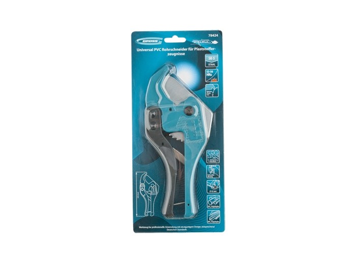 Ножницы торговой марки GROSS предназначены для резки пластиковых труб, плинтусов, профилей, резиновых шлангов и пр. диаметром до 42 мм. Прямая форма рабочего ножа позволяет резать и плоские изделия из вышеуказанных материалов. Корпус ножниц из сверхпрочного алюминиевого сплава, лезвие из высокоуглеродистой стали SK2 и усовершенствованный храповой механизм позволяют отнести инструмент к профессиональной линейке.