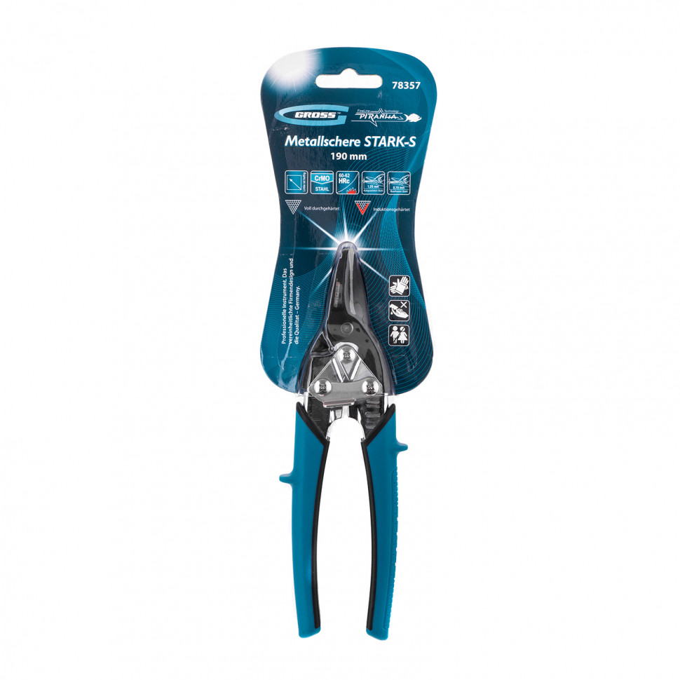 Ножницы по металлу торговой марки GROSS предназначены для точного прямого реза листового металла толщиной до 1,2 мм и нержавеющей стали толщиной до 0,7 мм. Инструмент идеально подходит для работы в ограниченных пространствах. Рабочие части ножниц изготовлены из высоколегированной стали (CrMo), содержание молибдена и ванадия в ее составе придает необходимую жесткость и высокую твердость. Режущие губки проходят процесс индукционной закалки и имеют твердость 60–62 HRС. Ножницы общей длиной 190 мм оснащены эргономичными антискользящими рукоятками, оригинальная форма которых минимизирует риск травм и обеспечивает удобство при длительных работах.
