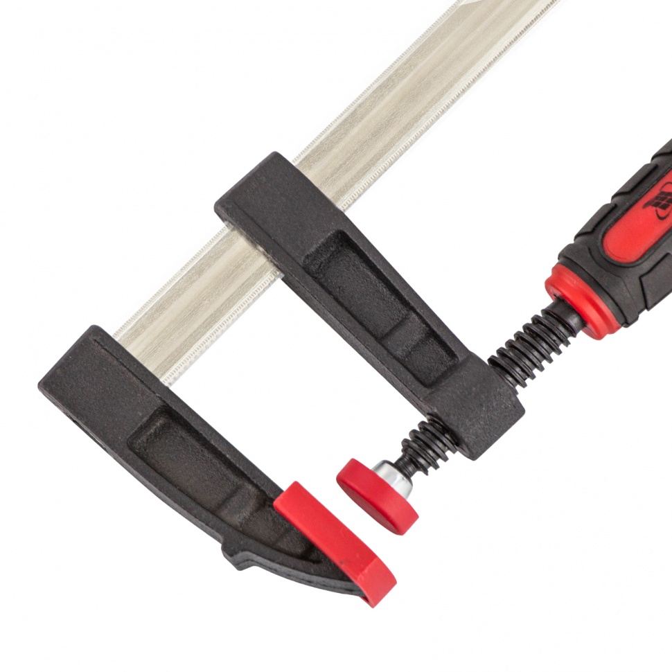 F-образная струбцина Matrix 20405, 300 х 50 х 370 мм, используется для зажима металлических, деревянных и других заготовок для их последующей обработки или сборки. Представляет собой штангу, на которой установлены 2 кронштейна — неподвижный и подвижный. Деталь помещается между ними и прижимается к губкам при помощи винтового зажима с трапециевидной резьбой. Величина захвата может достигать 300 мм, она регулируется при помощи подвижного кронштейна. Струбцину применяют при выполнении слесарных и столярных работ.ПреимуществаМеталлическая конструкция выдерживает высокую температуру, поэтому инструмент пригодится во время сварки (необходимо снять пластиковые накладки с губок).Прочная стальная штанга выдерживает повышенные нагрузки и позволяет фиксировать заготовки со значительным усилием.На губках установлены пластиковые накладки, которые предохраняют поверхность детали от повреждения при сильном сжатии.Эргономичная двухкомпонентная обрезиненная рукоятка имеет рельефный дизайн и не выскальзывает из ладони, обеспечивая комфорт во время работы.